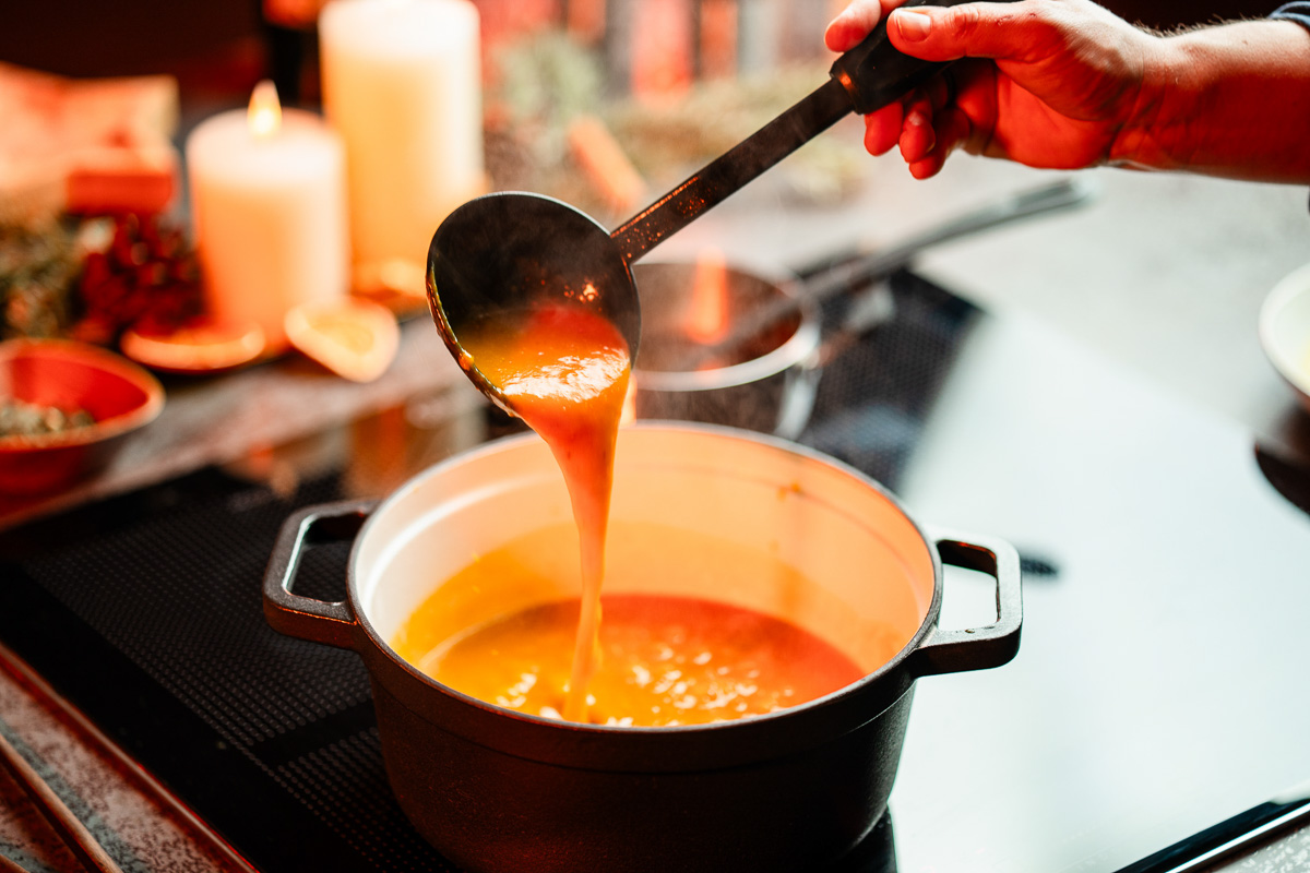 Unser veganes Weihnachtsmenü für zwei Personen besteht aus Süßkartoffel-Kürbissuppe mit gerösteten Kürbiskernen und steirischem Kernöl Vegane „Keule“ mit Rotkohl, Rotweinjus und Klößen Weihnachtsbrownie mit Orangen-Toffee.